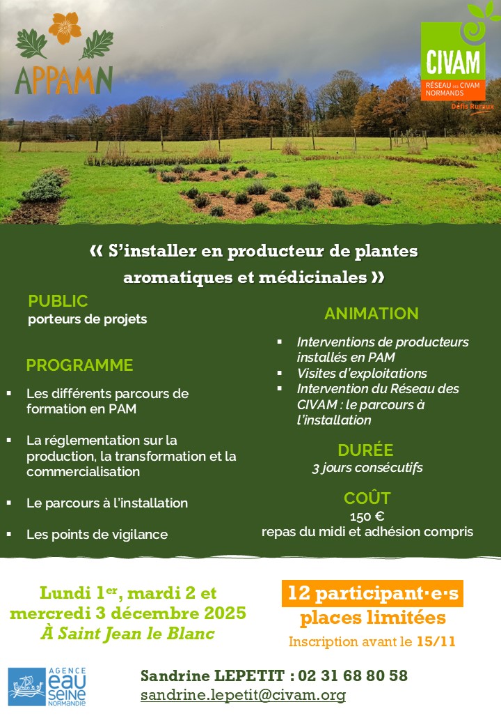 Encadrée par le Réseau des CIVAM Normands et l’Association des Producteurs de Plantes Aromatiques et Médicinales de Normandie (APPAMN), cette formation allie théorie et terrain : réglementation, explication du parcours à l’installation mais aussi visites d’exploitations et témoignages de producteurs passionnés.